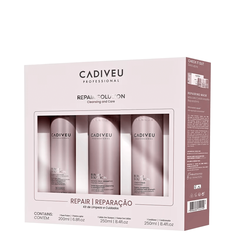 Rotina completa para recuperar a força e o brilho dos fios em casa. O Kit de Limpeza e Reparação Cadiveu reúne três etapas que atuam em sinergia — higienização eficaz, tratamento reconstrutor e selagem de cutículas — para reduzir o aspecto de danos, devolver maciez imediata e garantir movimento natural, com acabamento polido desde o primeiro uso.