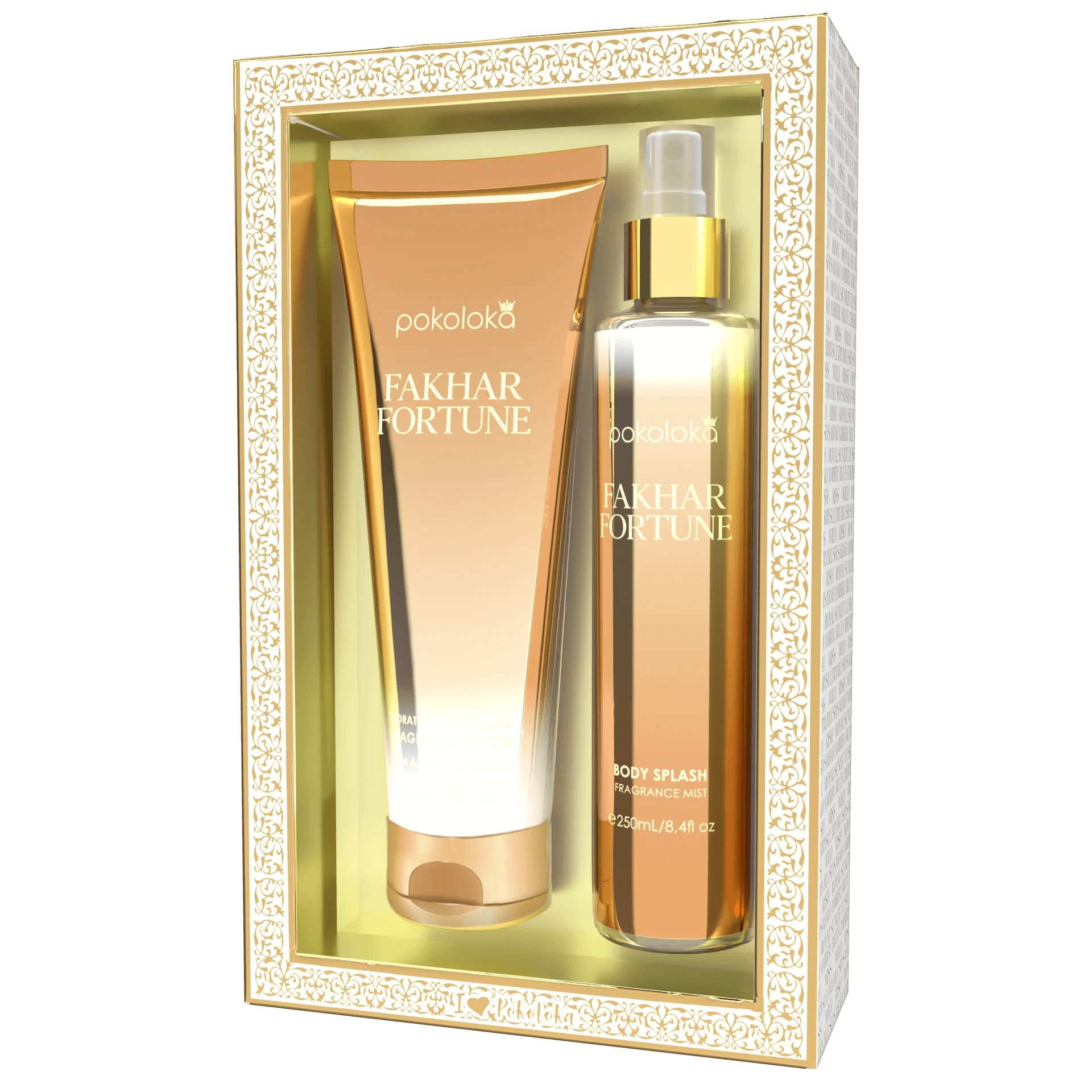 Um duo perfeito para hidratar e perfumar: o hidratante nutre e suaviza a pele sem pesar, enquanto o body splash acrescenta uma nuvem de frescor e prolonga a experiência olfativa de Fakhar Fortune.
