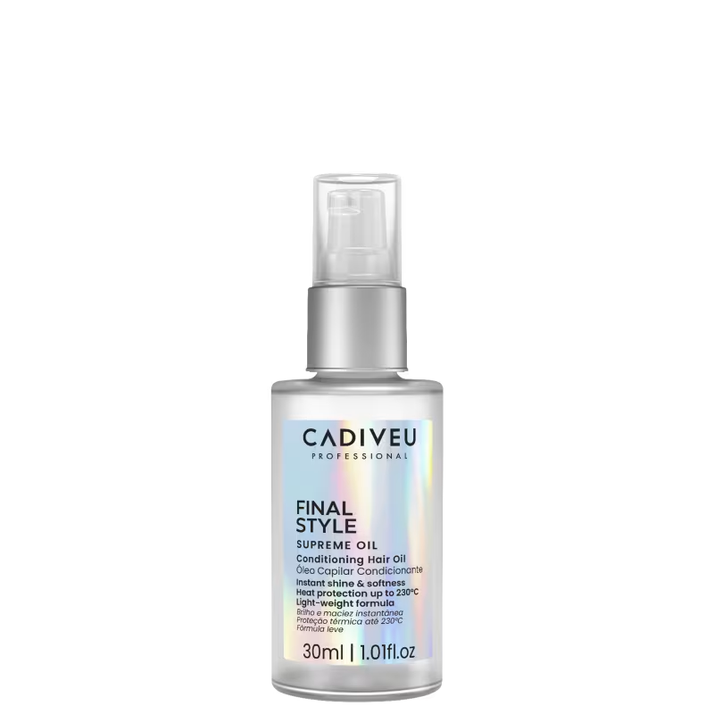 Finalize o penteado com brilho espelhado e toque leve. O Óleo Capilar Final Style da Cadiveu controla o frizz, suaviza as pontas e confere maciez imediata sem pesar, valorizando o movimento natural dos fios. A textura fluida cria um véu de luminosidade que protege do ressecamento diário e deixa o cabelo com acabamento profissional — perfeito para o dia a dia e para dar aquele “polimento” final em qualquer look.